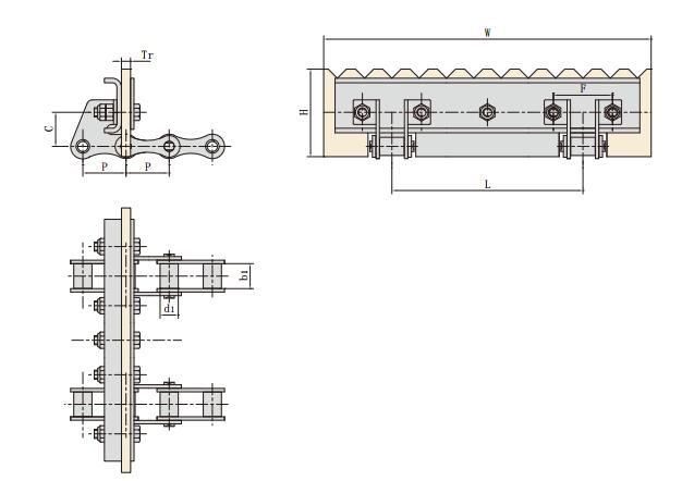 主要規(guī)格型號有:ZGS38F47(節(jié)距38mm,滾子直徑16.0mm,內(nèi)節(jié)內(nèi)寬22.00mm,橡膠附板尺寸W480.0mm,L360.0mm,H77.0mm,F52.0mm,Tr8.0mm)